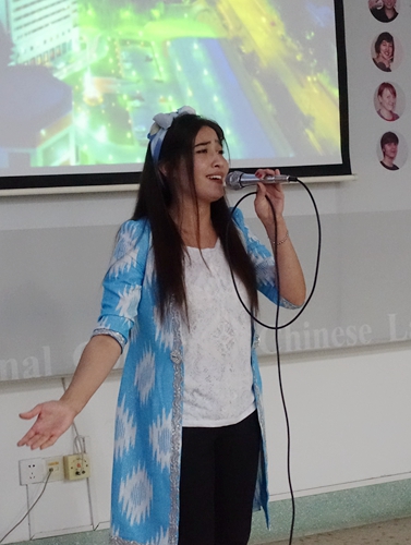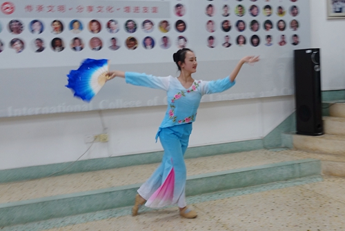 此次联欢会由我院来自马来西亚的研究生沈佳潓和中国的研究生黎津言担任主持。伴随着观众热烈的掌声,体育学院三位同学带来了一场刚柔并济、极具中国武术文化的太极拳表演,由此拉开了联欢会的序幕。随后,俄罗斯学生美莉和外国语学院中国学生共同表演的话剧《中国梦·女书情》,让留学生在幽默轻松的氛围中了解了独具特色的江永女书及封建时期的中国女性文化,通过演员惟妙惟肖的表演,激发了其对中国传统文化的学习热情。接着,来自日本的福泉春太郎弹唱歌曲《向日葵的约定》,深情款款,打动全场观众博得阵阵掌声。音乐学院的陈玥月则以一支独舞《一枝红杏》,给全场同学带来了丰富的艺术感受,用其轻盈曼妙的舞姿让留学生领略到了中国民间舞蹈的独特魅力。老挝留学生申龙一首充满异域风情的《Land Of Independence》过后,国汉院2017级全体研究生用多国语言合唱流行曲目《If You》将整场联欢会推向了高潮。阳光帅气的日本姑娘狄堂秀子也用激情活力的街舞表演燃爆现场,气氛热烈久久不能平息。乌兹别克斯坦的美丽女孩吉丽用她轻柔空灵的嗓音抒情演唱《我的国家》,带观众领略她自己国家的别样风情。最后,联欢会在活泼动感的印尼歌舞《Goyang Duyu》中落下帷幕。