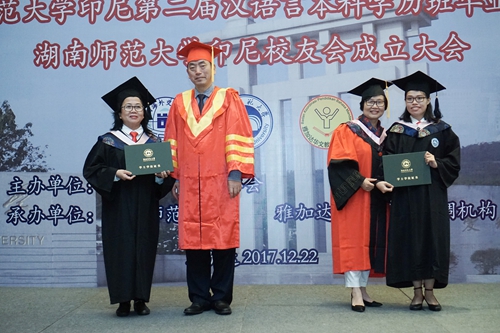 (通讯员 曾丽娟)12月22日,我校第二届印尼华文教师汉语言本科学历班毕业典礼暨印尼校友会成立大会在雅加达举行。黎大志副校长率团亲赴印尼参加典礼,印尼有关华文教育协调机构负责人,中国暨南大学、华侨大学等印尼校友会代表,印尼多家媒体代表,湖南师范大学国际汉语学院印尼硕士学历班讲学团教师,硕士学历班学员,本科学历班毕业学员及家长团等约300人出席典礼。