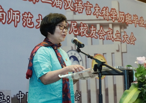 黎大志向印尼校友会授会旗,并与杨玲一同向首届理事会成员颁发了聘书。印尼校友会秘书长林玉秀受会长委托,就校友会的办会宗旨和任务作了发言。 据悉,印尼华文教师汉语言本科学历班是受中国海外交流协会委托,由我校与印尼雅加达华文教育协调机构共同举办。两届学历班共毕业学员156名,受到印尼华文教育各界广泛赞誉,是我校华文教育基地成立10多年来的重要成果。