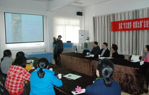 颁奖仪式结束后,蒋洪新作了题为《浅谈中西文化比较视域下的华文教育》的报告,在中西方文化的大背景下,结合国际关系,通过中西文化的比较来谈他对华文教育发展的看法。他指出,中西文化的碰撞不可避免,同时中西文化也相互依赖。在海外发展华文教育,应求同存异,找到中西文化的契合点,在此基础上传播中国文化、发展华文教育。他还提出了华文教师应具备的四点意识:具备跨文化交际意识,“自知而能知人”,传播中国优秀文化;具备历史意识,把握世界华文教育大势;具备人文教育意识,以仁爱之心关爱他人;具备经典阅读意识,“与古今中外无町畦”,开阔视野、全面发展。