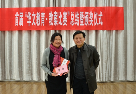 随后,蒋洪新、唐建文和唐秀丽为获奖华文教师颁发了获奖证书和奖金并合影留念。